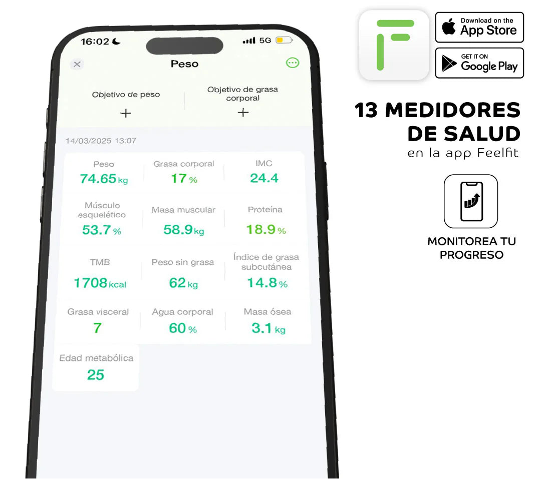 13 Métricas Corporales Avanzadas – Peso, IMC, % grasa, masa muscular, agua, hueso, proteína y más.