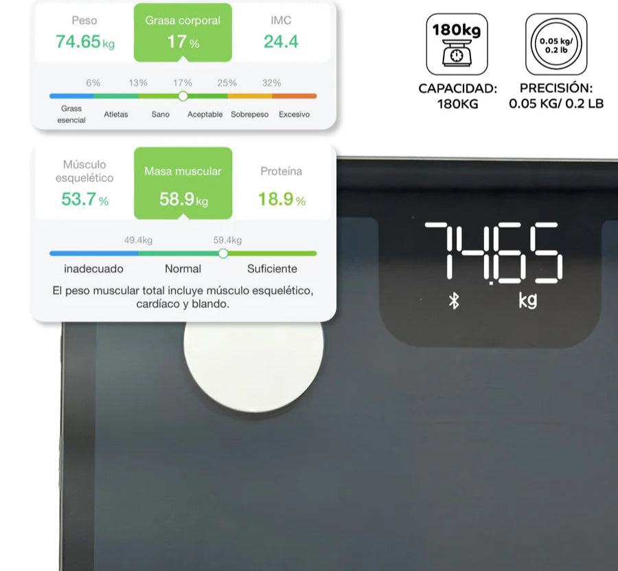 Alta Precisión con BIA – Sensores inteligentes, calibración automática, soporta hasta 180 kg / 400 lb.